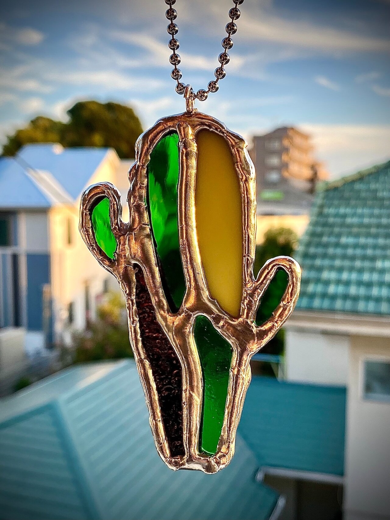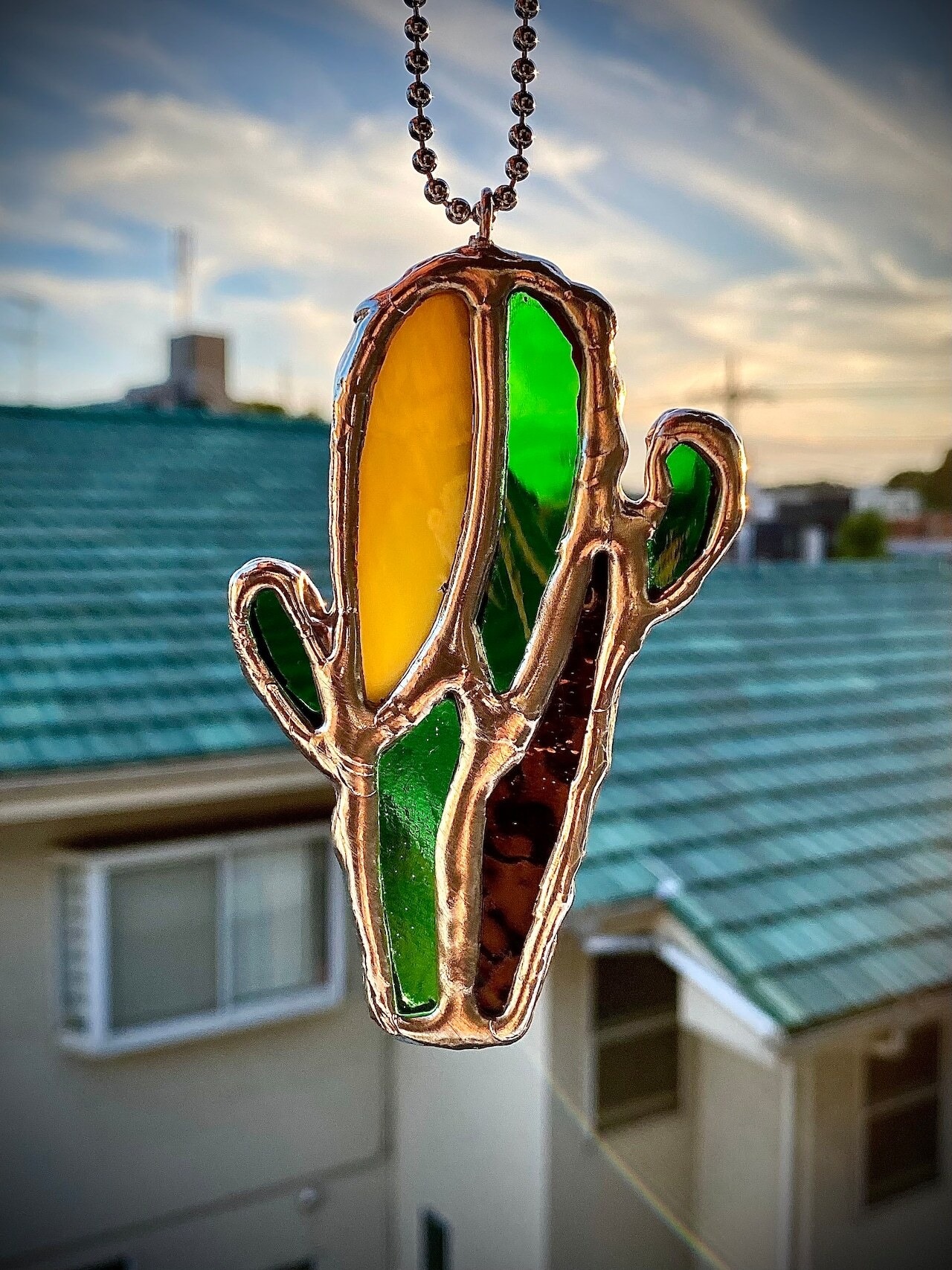 ハンドメイドのステンドグラスサボテンサンキャッチャー。