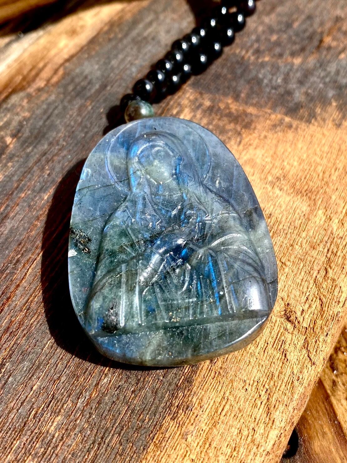 天然石パワーストーン、ラブラドライトのマリアカービングペンダントネックレスです。