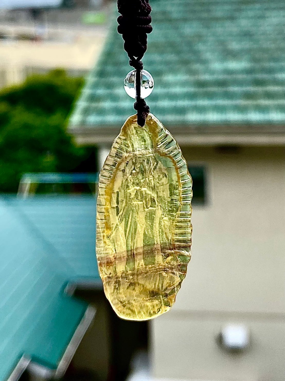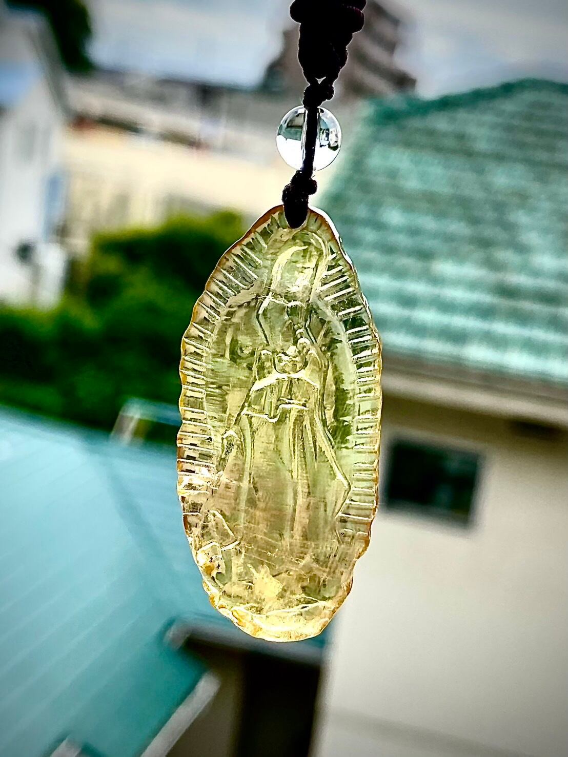 イエローフローライトのスタンドマリアカービングペンダントネックレスです。