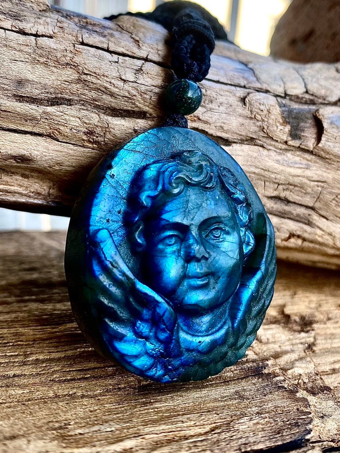 天然石パワーストーン、ラブラドライトのエンジェルカービングペンダントです。