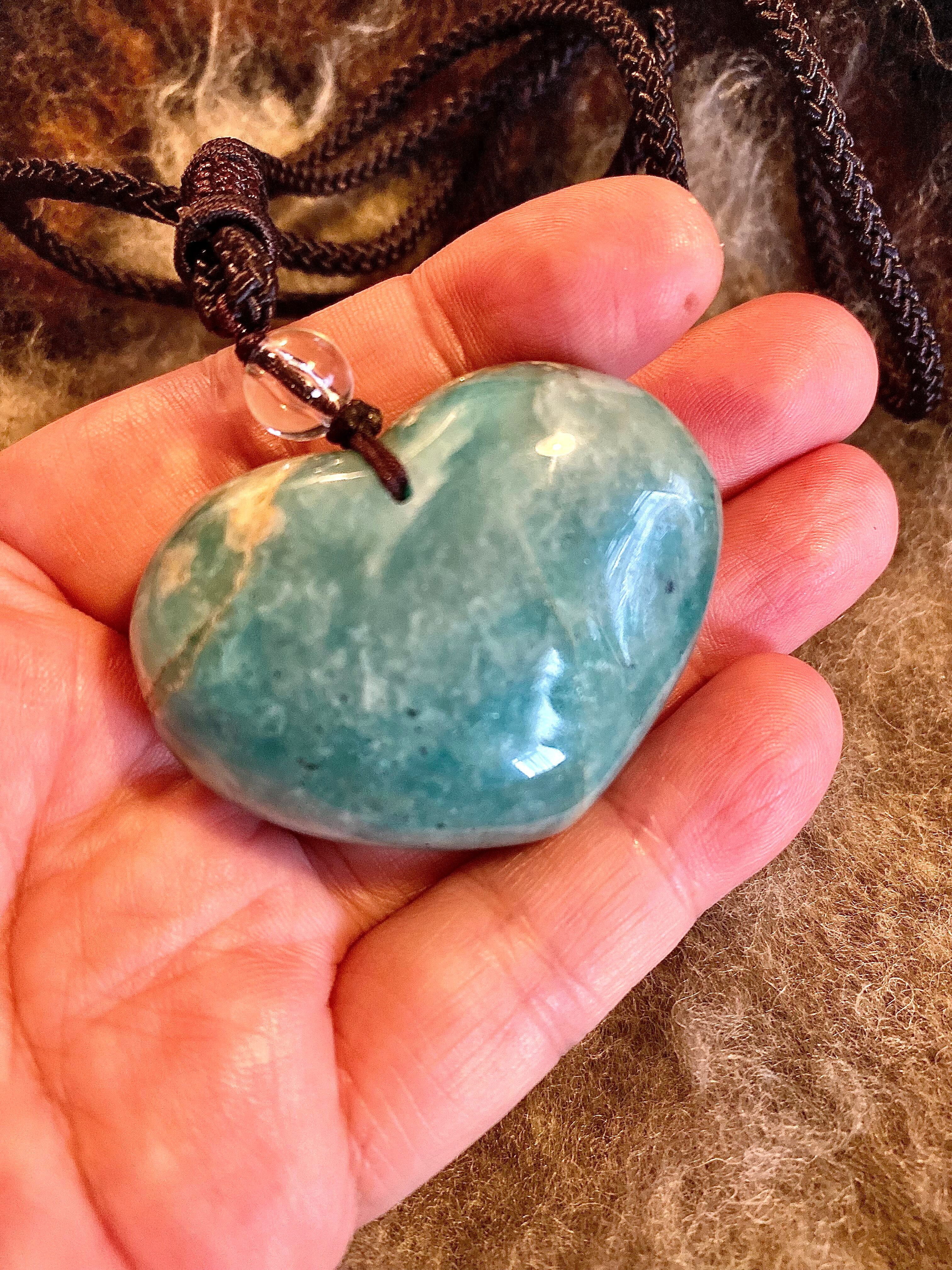 天然石アマゾナイトのぷっくりハートにドリルしてペンダントに仕立てました。